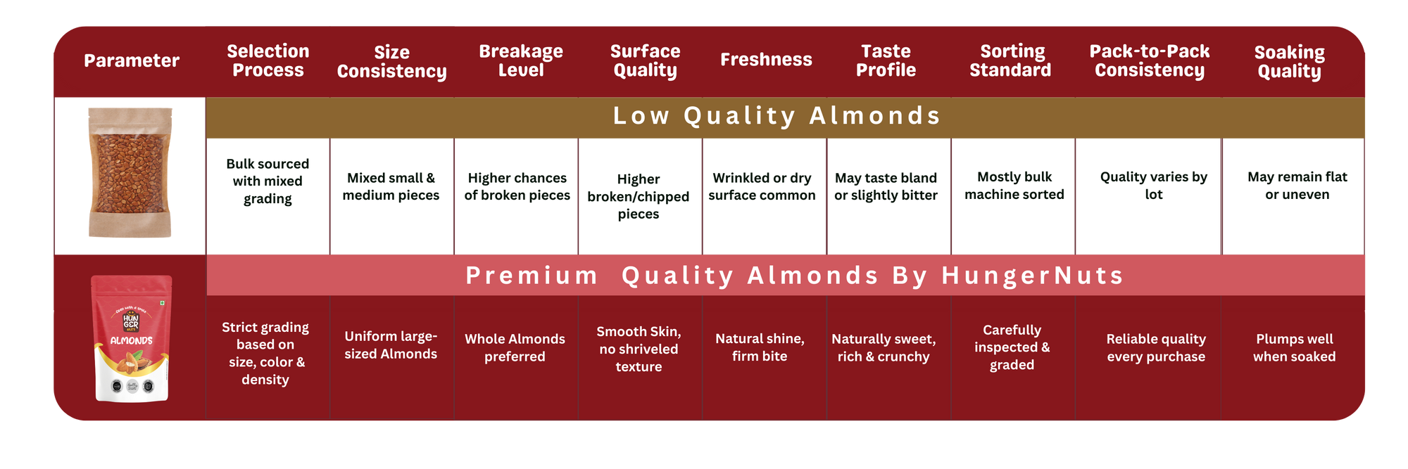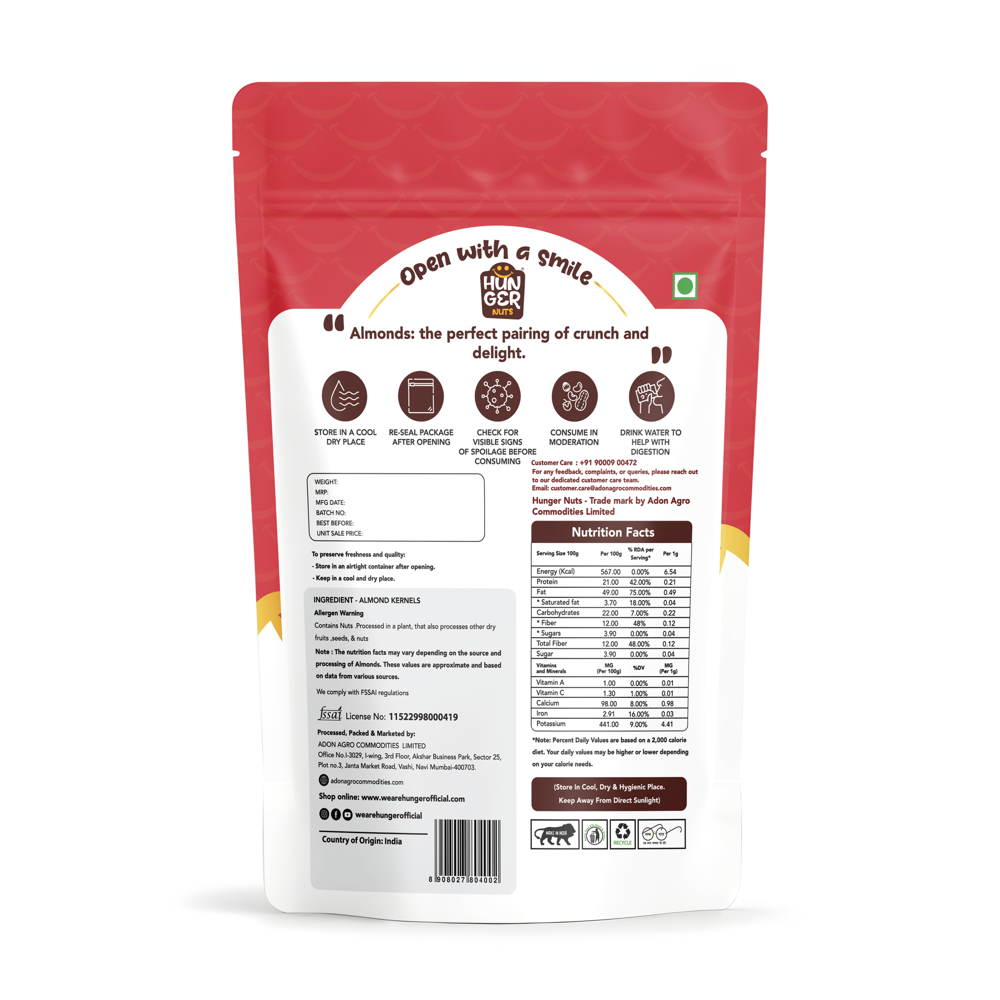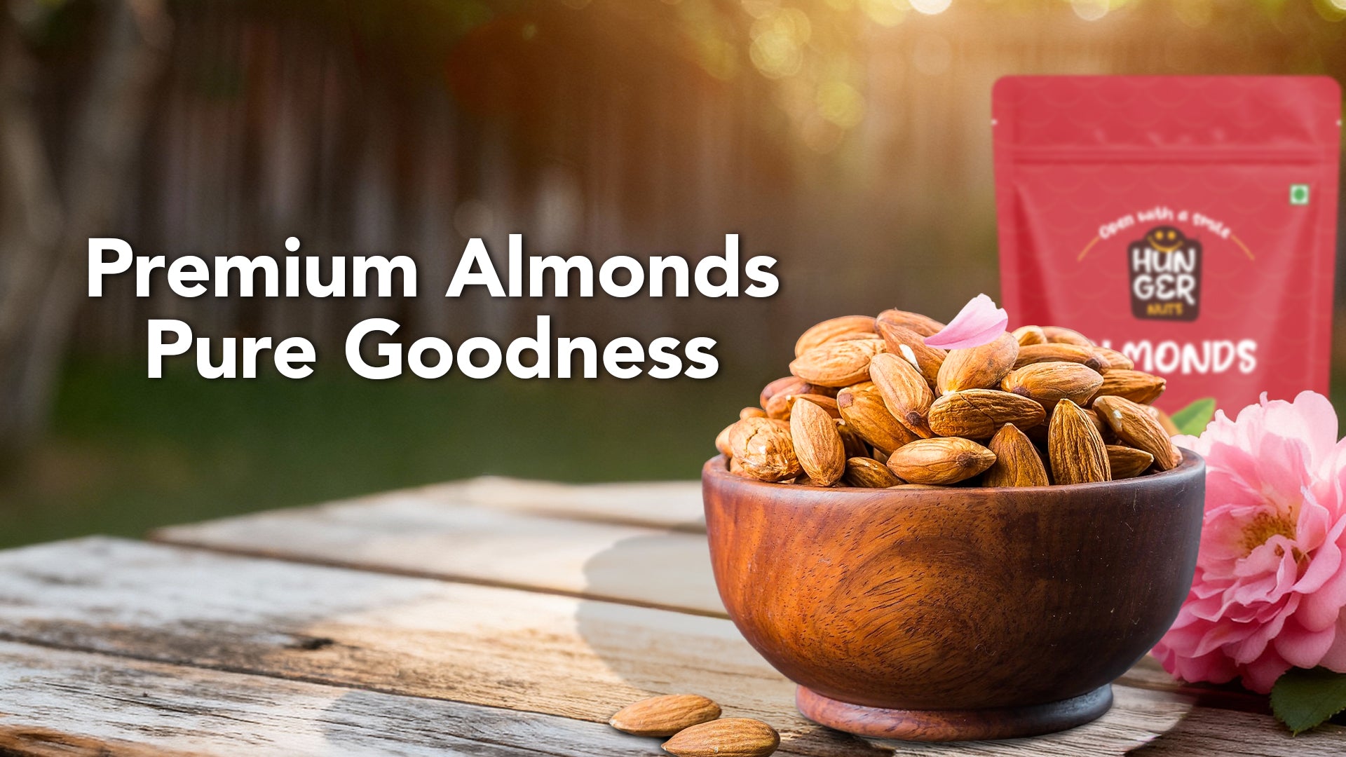 Hunger's almonds are premium quality due to their larger size, superior taste, smooth texture, and high nutritional content. They are sourced from certified farms, naturally processed, and ISO certified for quality assurance.