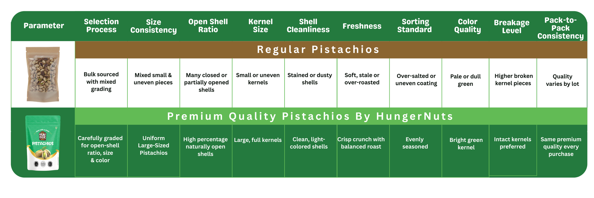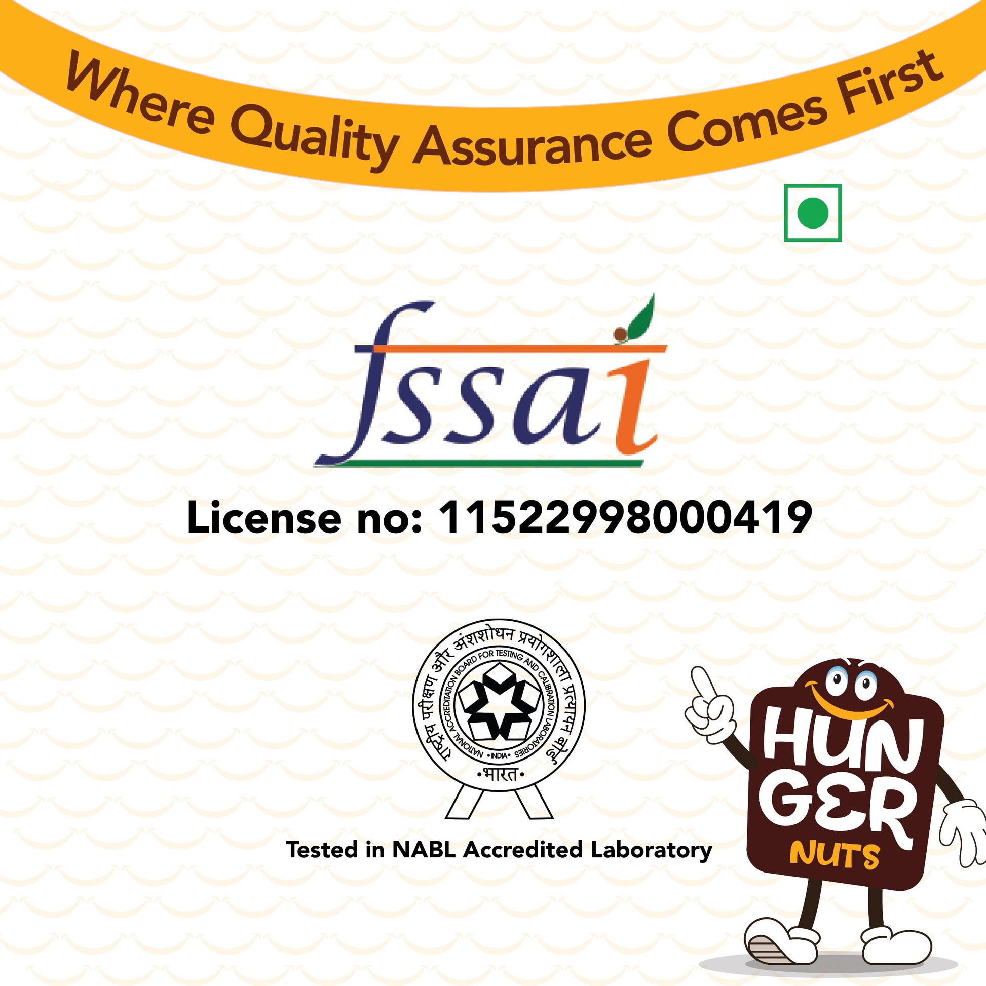 Hunger's almonds are premium quality due to their larger size, superior taste, smooth texture, and high nutritional content. They are sourced from certified farms, naturally processed, and ISO certified for quality assurance.
